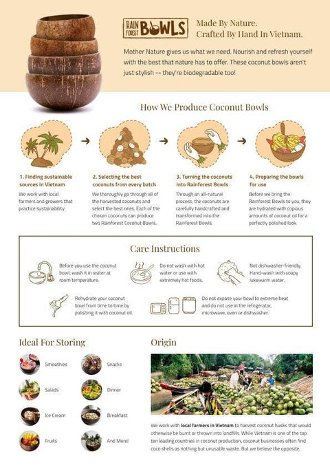 Rainforest Bowls works with artisans in rural communities to ethically source raw / natural materials. They save coconut shells from being burnt or ending up in a landfill, reclaiming them for your home & kitchen.
